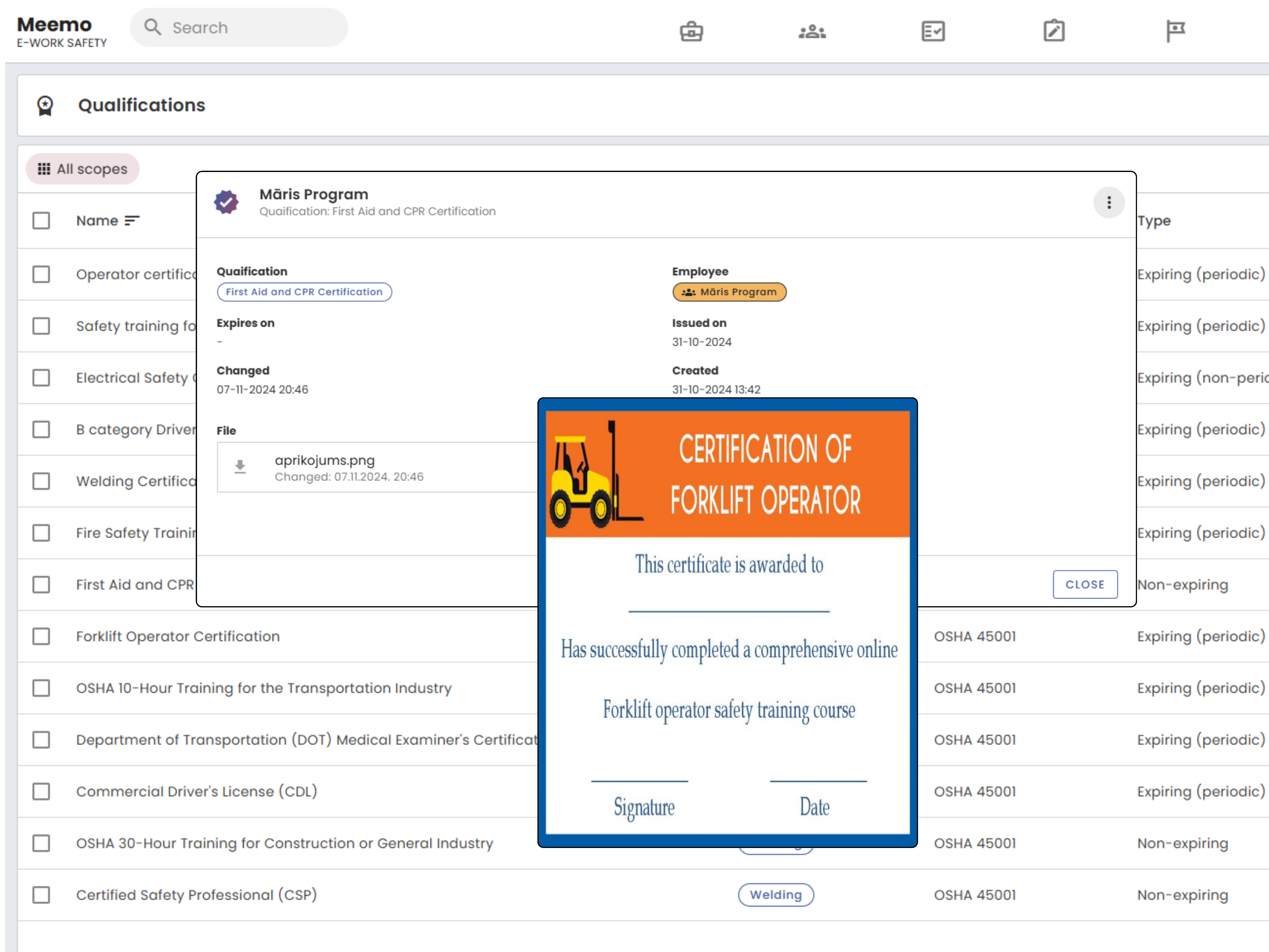 Vienots reģistrs obligāto apmācību statusiem, sertifikātiem un atjaunošanas termiņiem darbiniekiem.